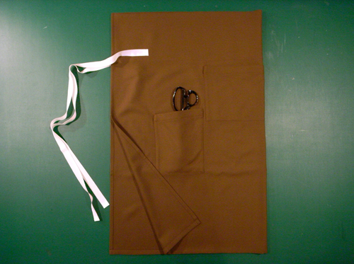 Golden brown wool nylon twill full waist apron with white grosgrain tapes, side pocket, 2-in-1 bib pocket(to put away the scissors,wallet & statement of delivery・receipt)in front. Cover cloth of high waist will guard the clothes from the soil and water.